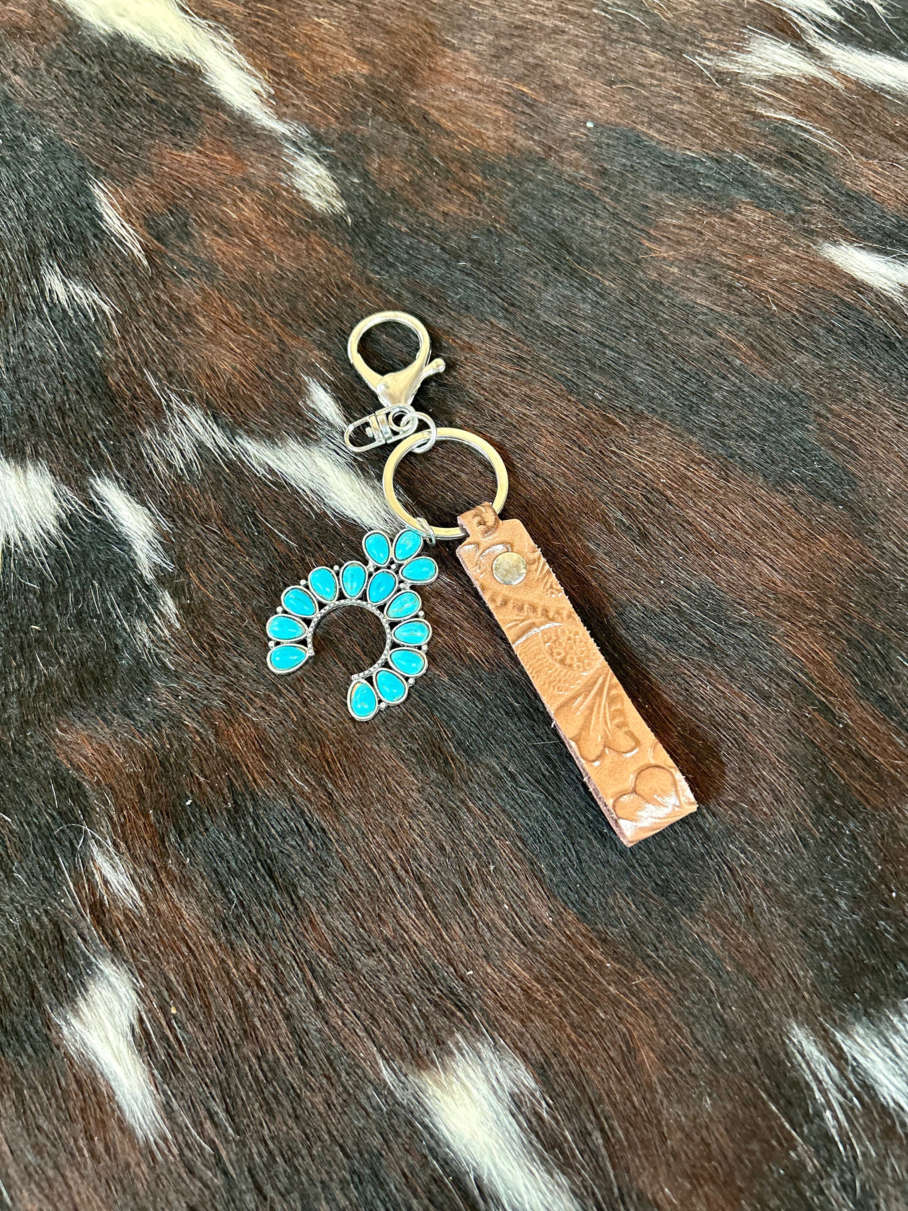 This unique key chain offers a wild, southwestern style! The Squash Blossom Pendant and the tooled leather strap make it the perfect accessory to signify your individual style. Crafted with turquoise, each key chain is sure to stand out! Add a touch of the wild west to your day.