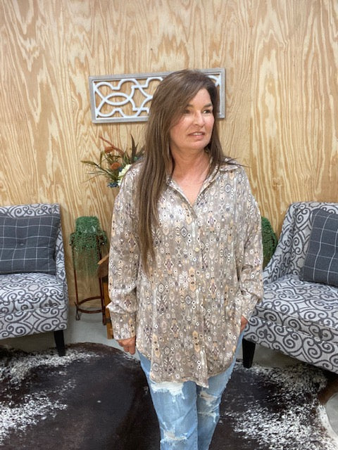 Look at this Boho print shirt. This is a loose fit shirt as you can see that it is big on the model and she wears a small and the shirt is a small, but it is larger than most small. Super roomy shirt. Would recommend sizing down if you want it to not fit snug.