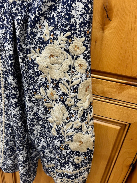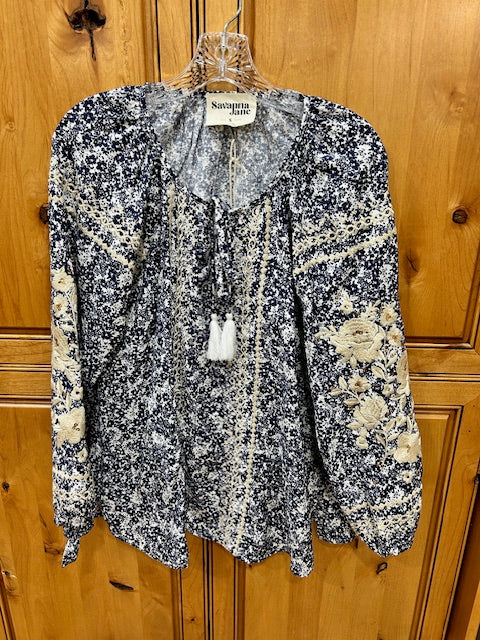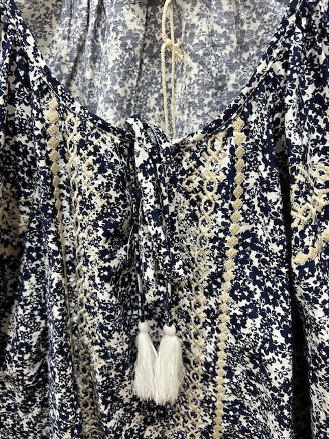 This flowy top has beautiful embroidered details. We love the loose fit and scoop neck with a tie string. Very popular top.