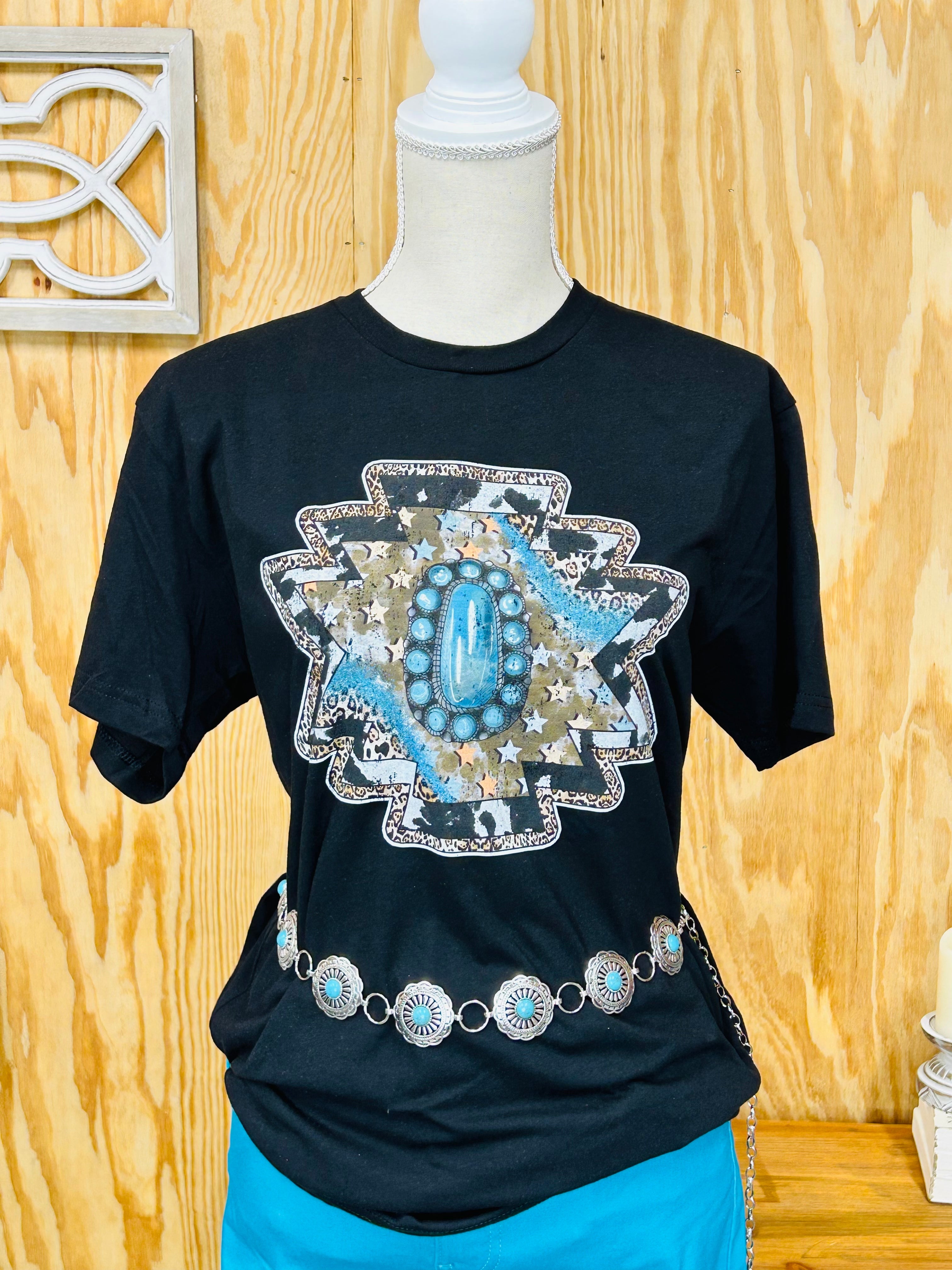 Experience the wild with the Aztec Cowhide Turquoise next level tee! The black short sleeve tee sports an Aztec design featuring cowhide and leopard print, accented with a turquoise concho in the center. Crafted with 100% cotton, this tee is soft, comfortable, and stylish- sure to make a statement! Dare to be bold!