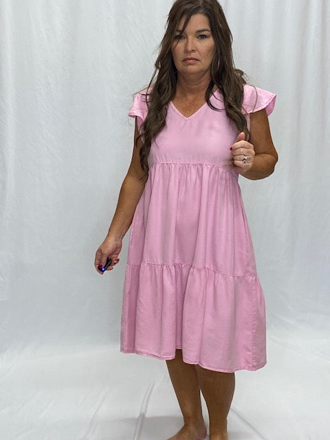 Solid chambray style dress features tiered layered with V-Neck and flutter sleeve and pockets.